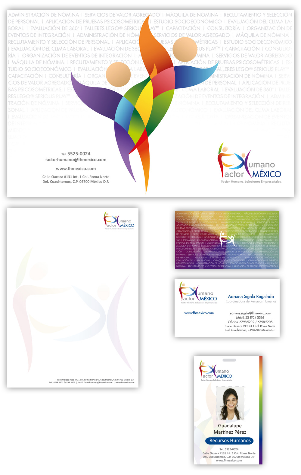 Diseño de folder, hoja membretada, tarjetas de presentación y credencial para Factor Humano.